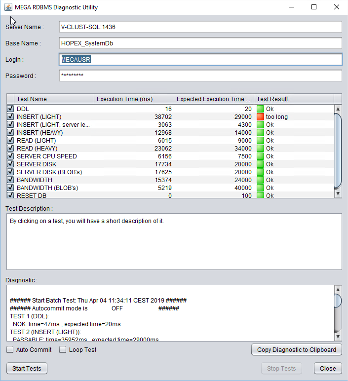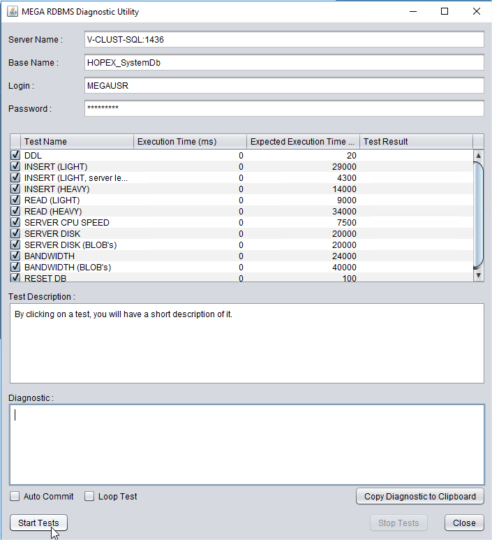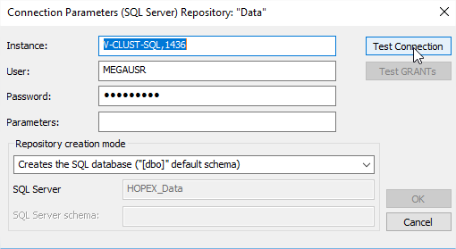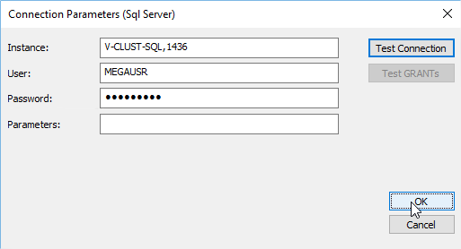 3. Provide the instance name, and the credentials of the „MEGAUSR“ native account, then click Test Connection: