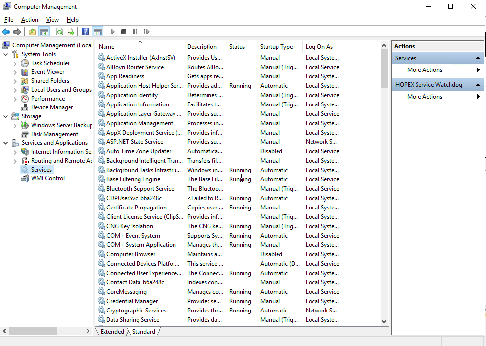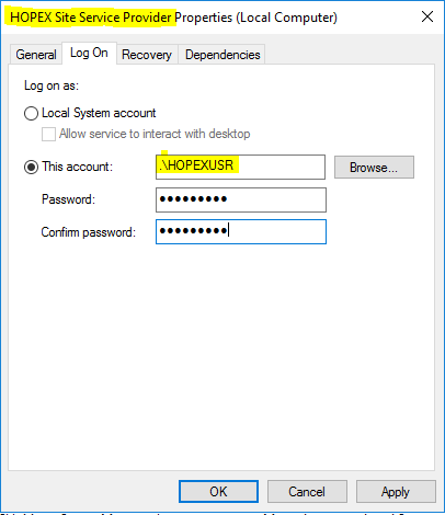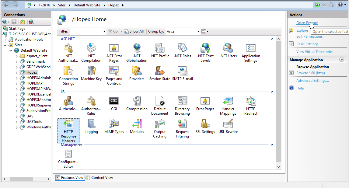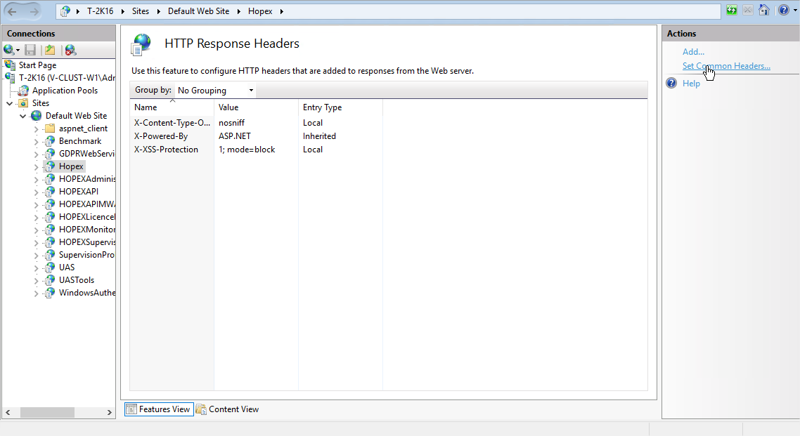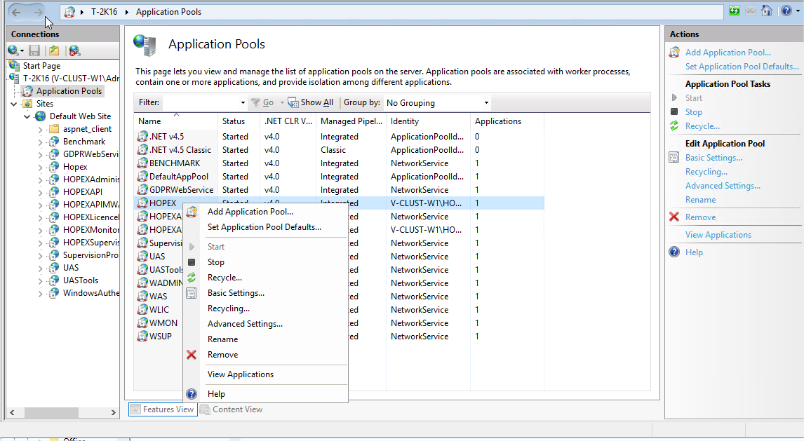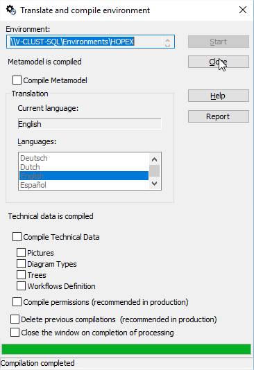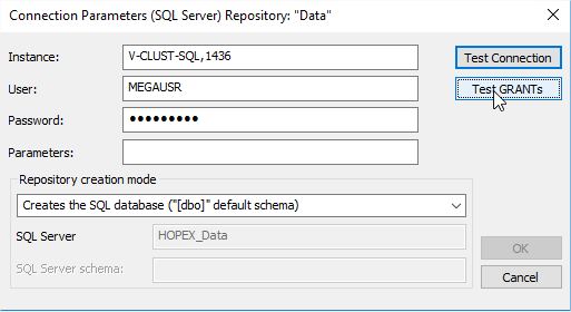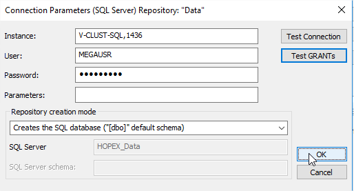 We use a SQL Server native account called “MEGAUSR”. Password is shared to the people that can use this platform to deploy the solution. It has “dbcreator” right at the instance level, as well as the securable “view server state”. Thus, it will be able to create new databases through Hopex.