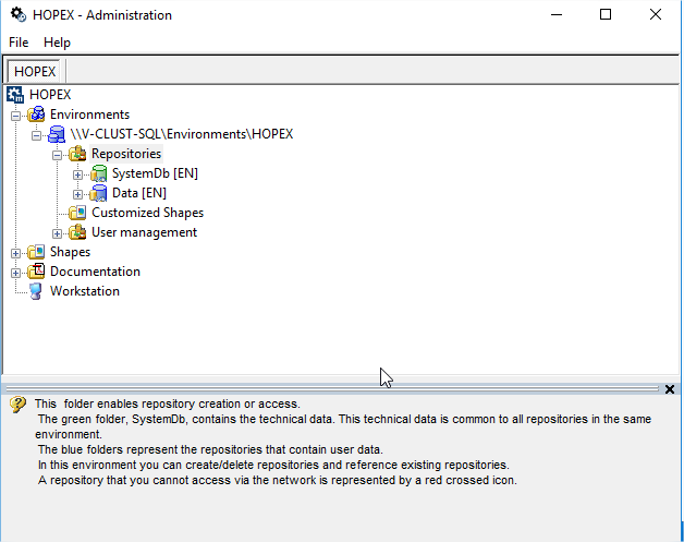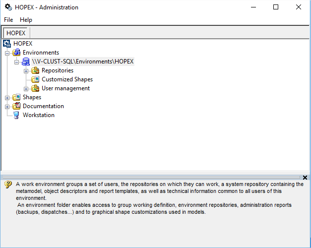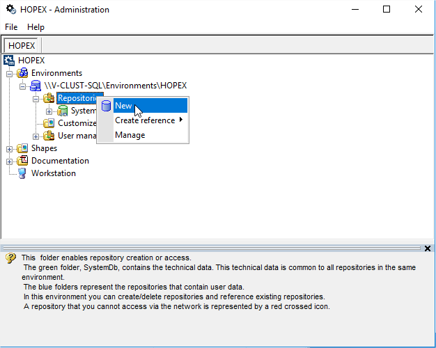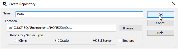 3. Enter the name of the environment (in our case “HOPEX”), the location of the folder (\\V-CLUST-SQL\Environments) to be created, its type (SQL Server), and click OK: