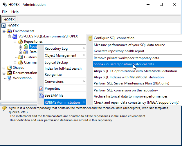 4. Right-click each repository, starting with the SystemDb : choose « RDBMS Administration », then « Remove Private workspace temporary data »