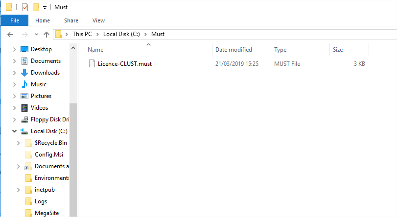 The physical folder is located on the RDBMS Server, and is “C:\Must” (note that the license file was already copied in the folder):