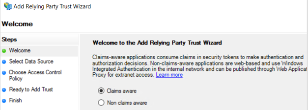 4. In the Welcome page, select Claims aware.