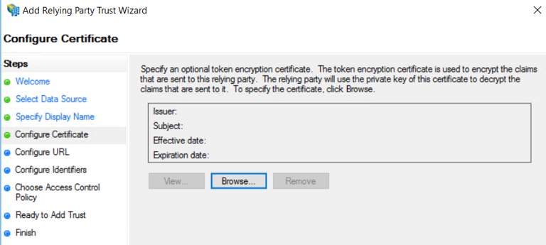 11. In the Configure Identifiers page, enter the Relying party trust identifier:
