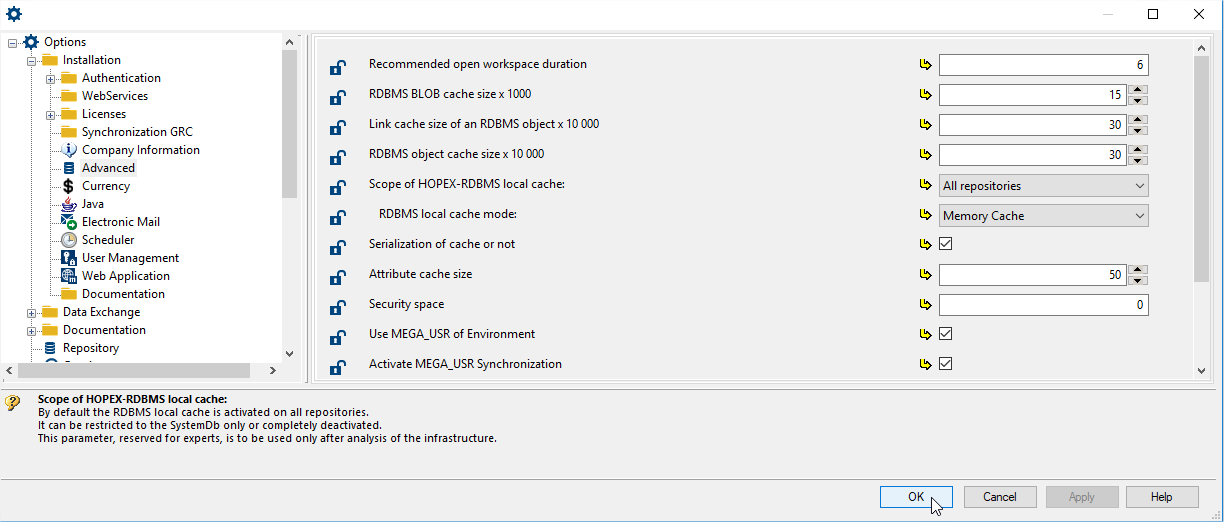 5. In the right pane, for the Scope of HOPEX-RDBMS local cache option, use the drop-down list to modify the range of that cache: