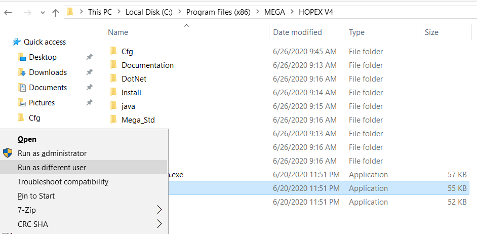 Hold down the “Shift” button, right-click Hopex.exe and select “Run as different user”: