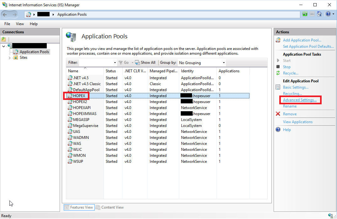 8. Repeat this procedure for the HOPEX2 application pool if you deployed HOPEX.