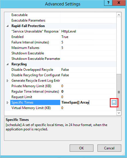 To avoid that, the installer disables completely this recycling, and use the default idle timeout, that says that after 20 minutes of complete inactivity, the worker process will stop (it will automatically start next time someone tries to access the website).