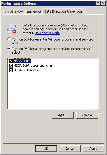 You can either turn on DEP only for essential Windows programs and services, or add exceptions for the following Mega programs (default installation locations):