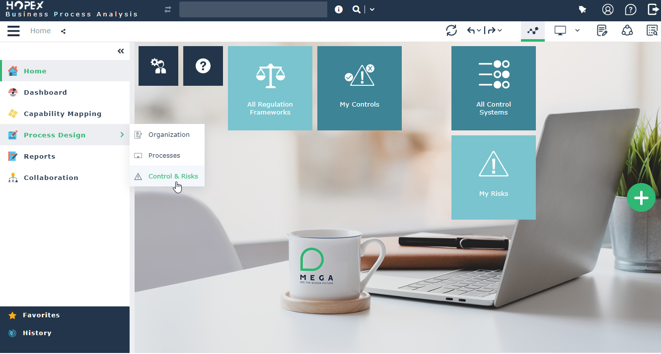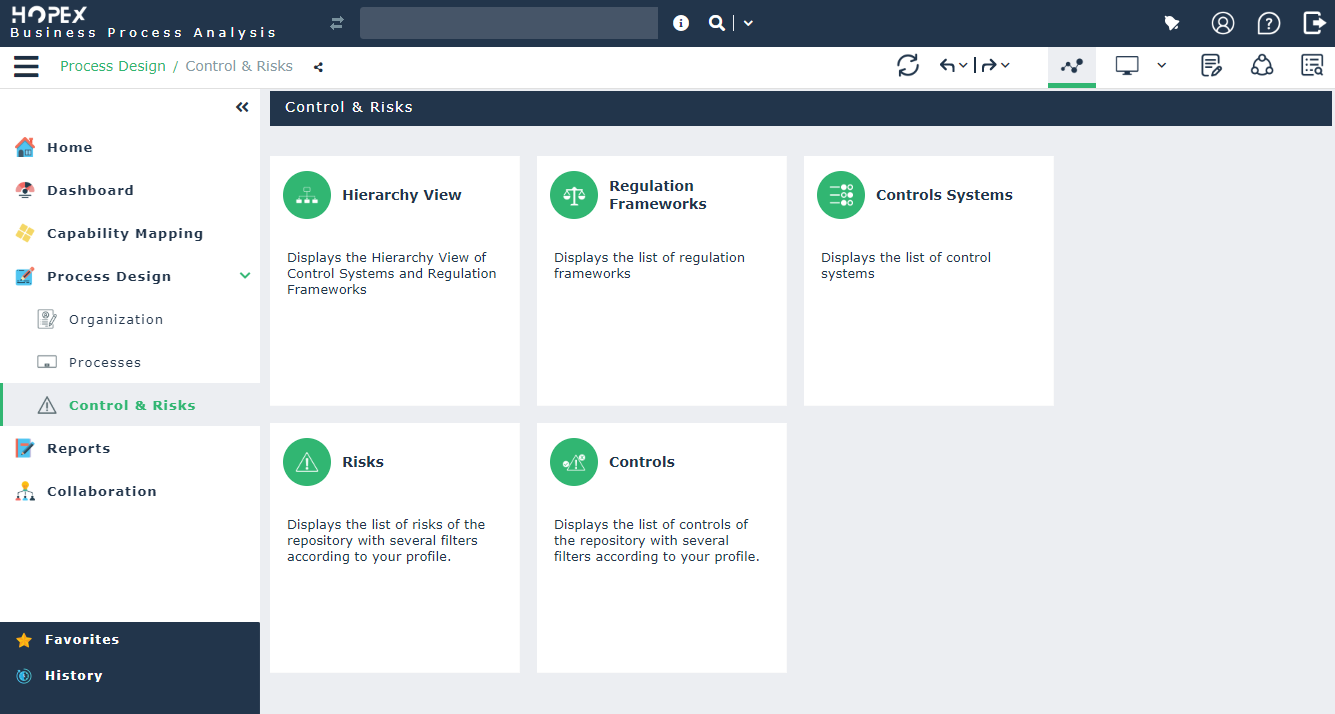 • Controls & Risks, for accessing the risk management features offered with the HOPEX Risk Mapper product.