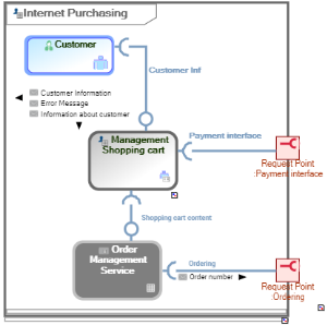 Requests made by customers are processed by a "Management Shopping Cart" logical application system. The "Order Creation" logical application is then used in the context of this architecture.