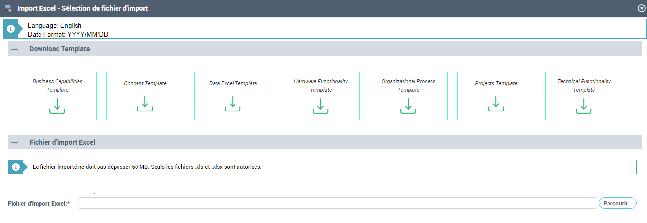If you want to export business capability maps or functionality maps that exist in another repository than your current one, for example, you can use the Excel template of HOPEX Business Architecture.