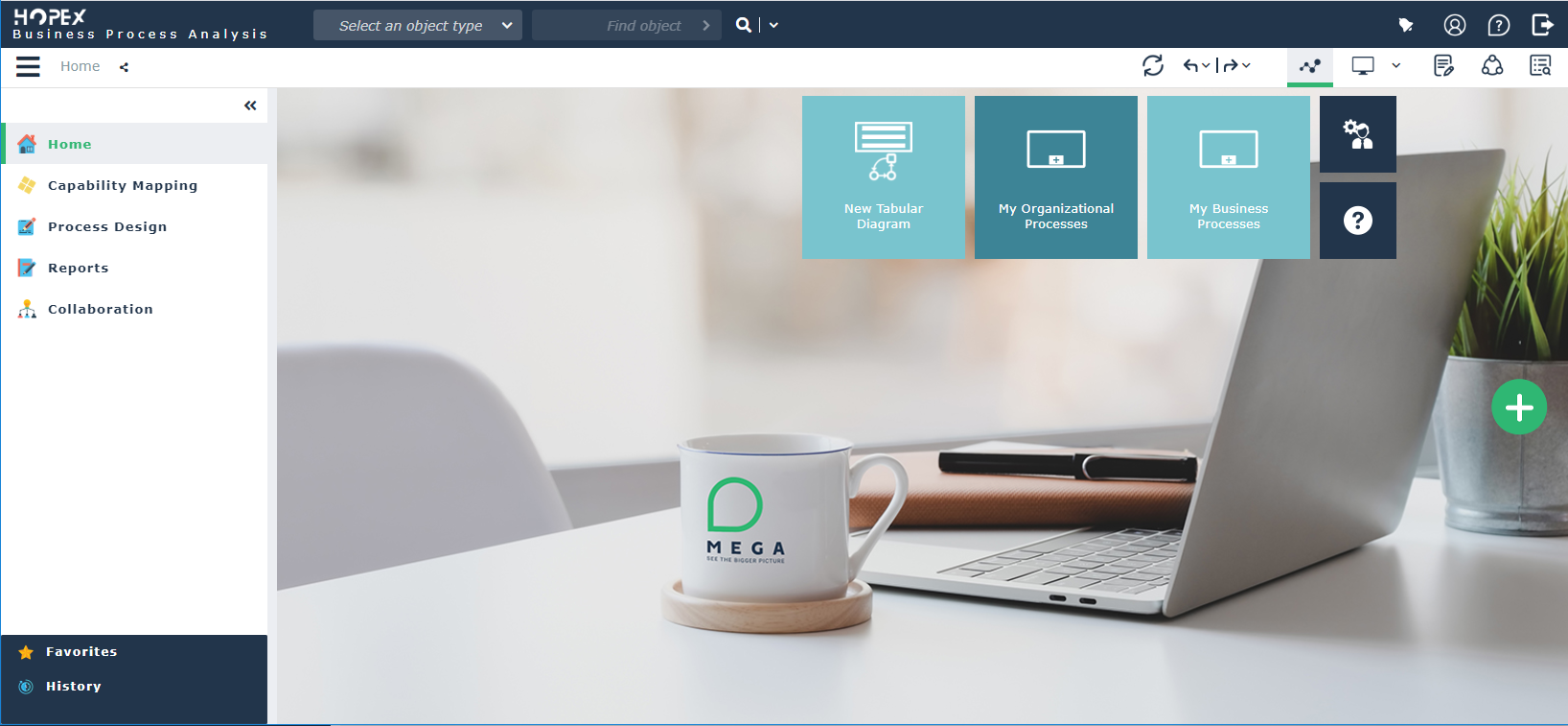 • Collaboration, which enables access to all collaborative tools provided by HOPEX.