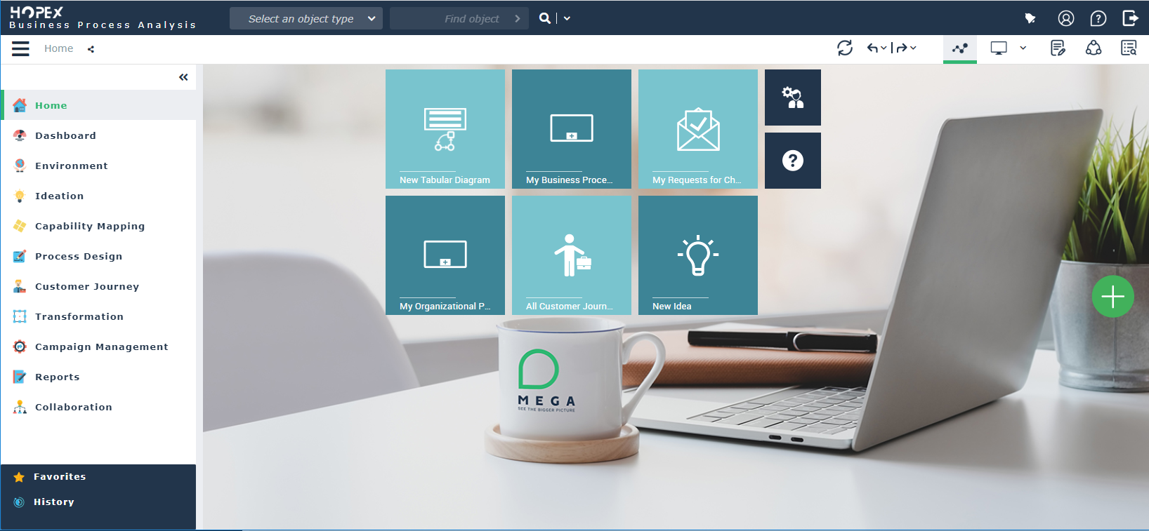 The tiles of the Home space of HOPEX Business Process Analysis are: