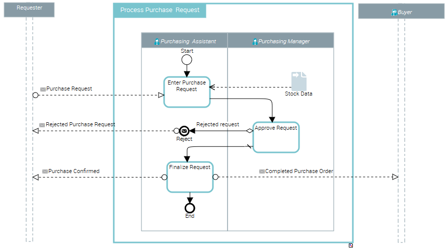 • The frame containing the different components represents the organizational process described by the diagram. Its name "Process Purchase Request" appears in the box at top left.