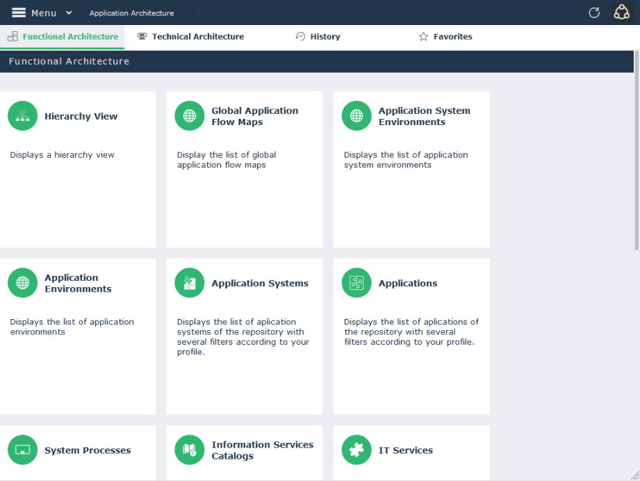 Example: The Application Architecture navigation pane displays the Functional architecture tab and shows its associated tiles.