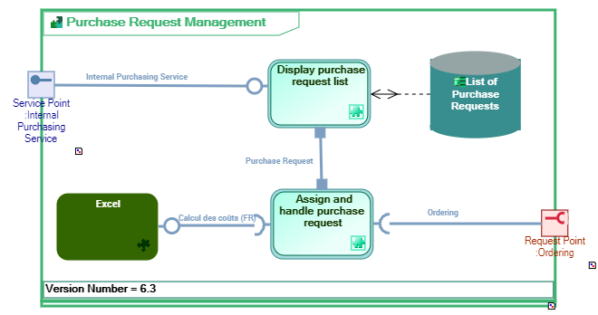 The “Purchase Request Management” application uses two IT Services: “Display purchase request list” and “Assign and handle purchase request”. The “Assign and handle purchase request” IT service invokes Excel micro-service.
