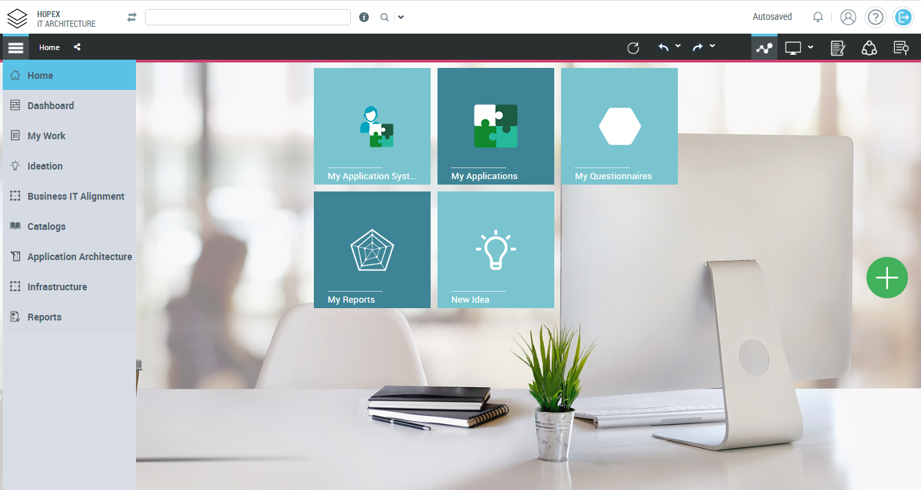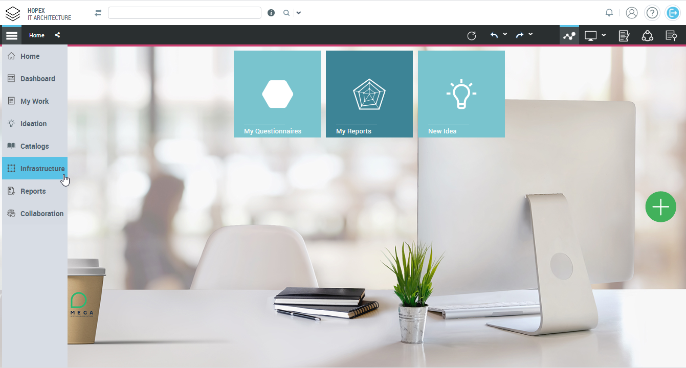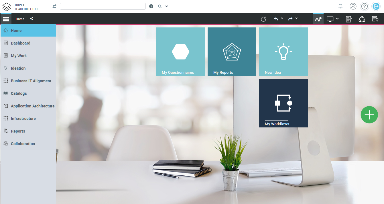 HOPEX IT Architecture V2 Home space proposes a add tile button