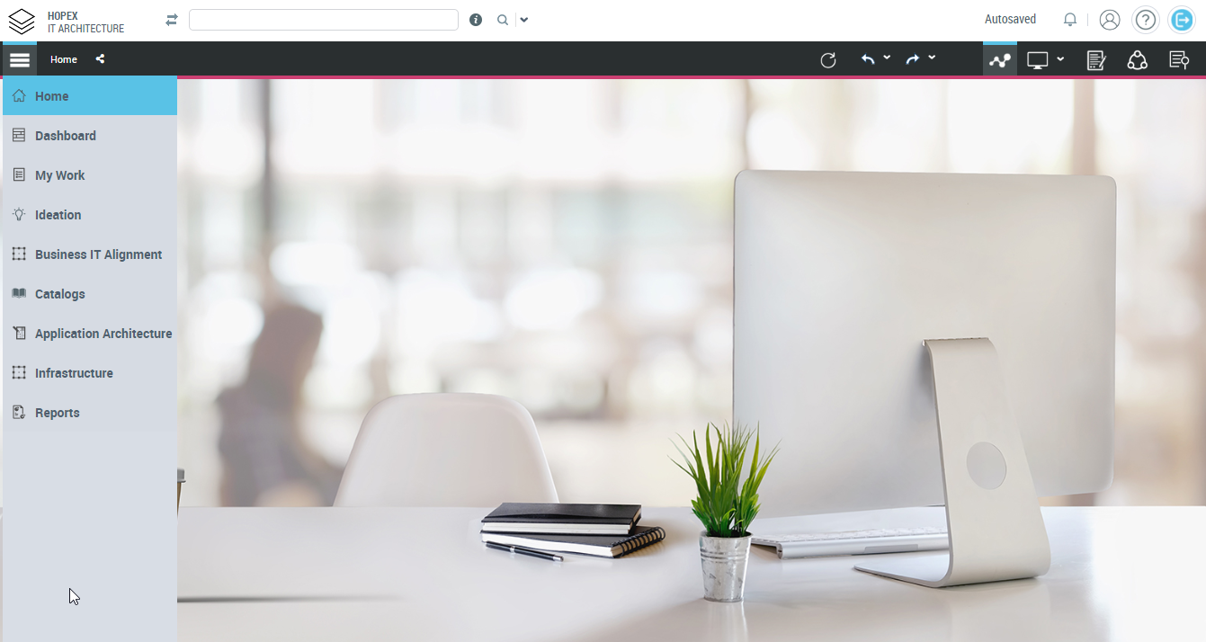Users connected with the Applications Contributor (lite) profile have access to the Entreprise Architecture desktop for HOPEX solutions via the HOPEX Explorer application.