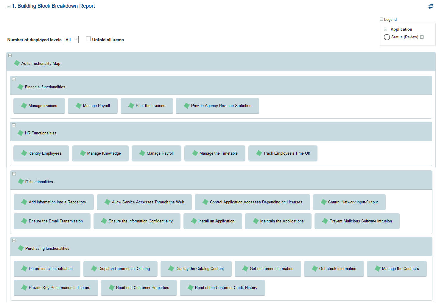 EA Level | Multiple choice: - business function level, - organizational level, - application level, - technical level. | Define which objects of which type of architecture level are displayed for capability realizations; For example, activation of the "applications level" displays the business capability realizations for the Application System Environment, the Application Systems or the Applications |