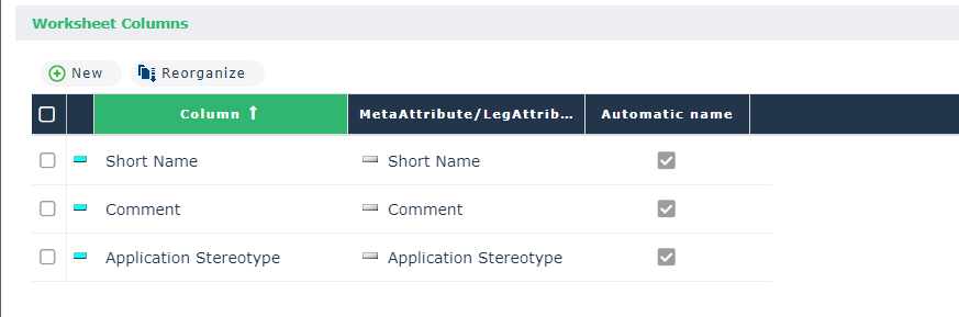 Worksheet Columns section. For each application, the name, code, comment and type are displayed.