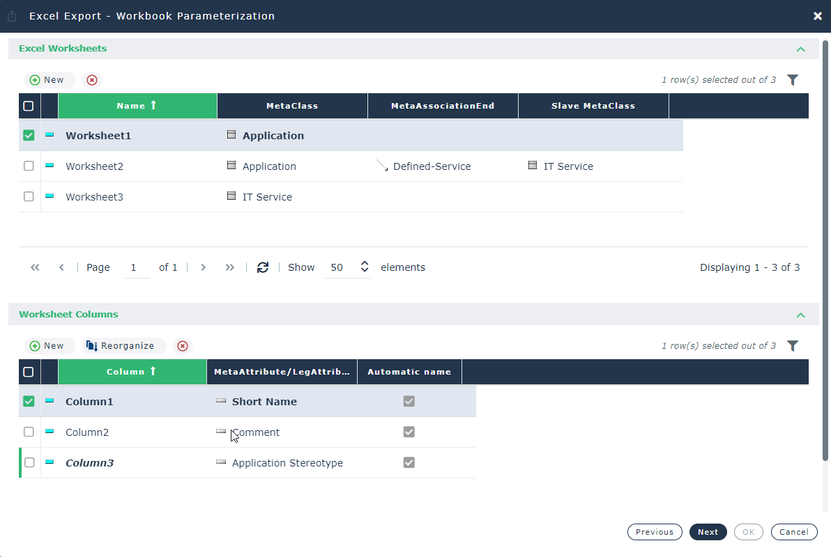 When selected, the Automatic Name check box indicates that the file column takes the name of the MetaAttribute (for example "Short name"). If you clear this, the column takes the name indicated under Column ("Column 1").