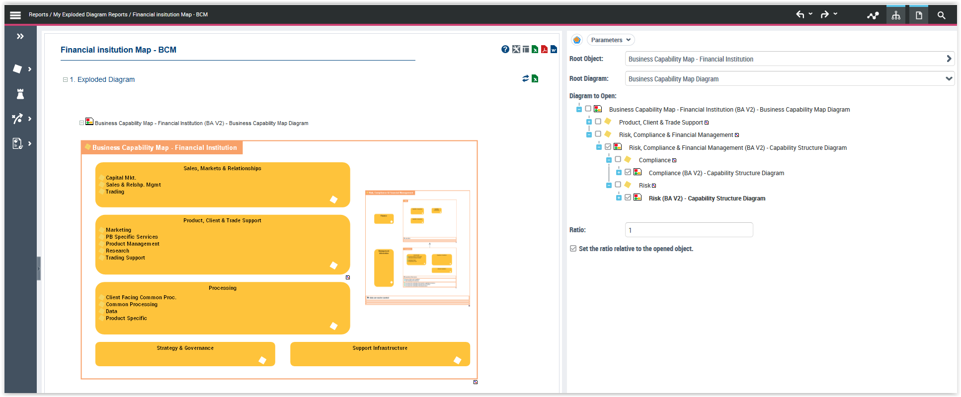 Report of exploded diagrams in a business capability map