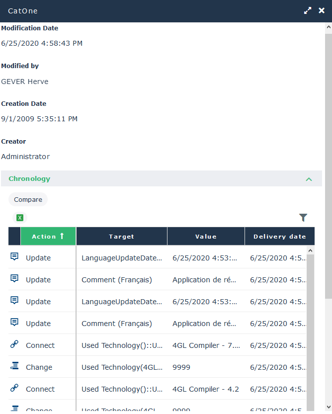 2. Click Compare to compare the attribute values and links of an object between two dates.
