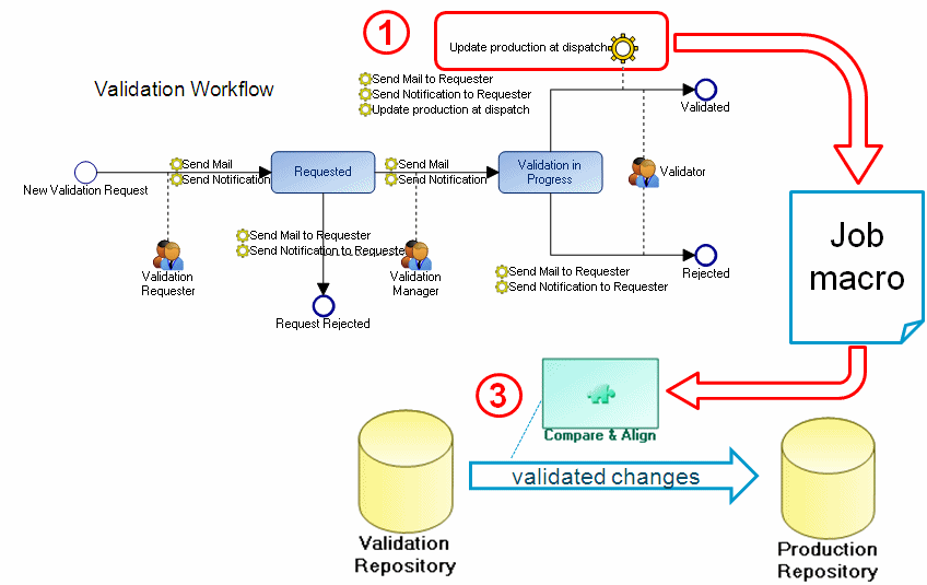 If transfer is under the responsibility of users working in the source repository, this mode can prove to be restrictive. In this context, users connected to the source repository must: