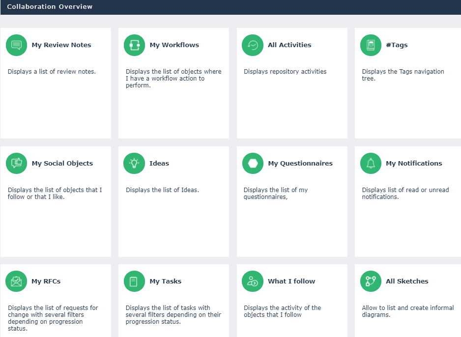 Depending on the desktop on which you work, the Collaboration navigation pane provides access to:
