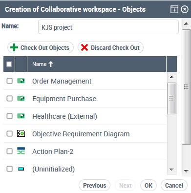 The objects appear in the list of objects in Check Out in your collaborative workspace.