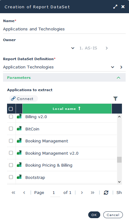 The parameters define the object groups and their relationship setting in the report. They vary according to the Report DataSet Definition. A parameter value can group several objects.