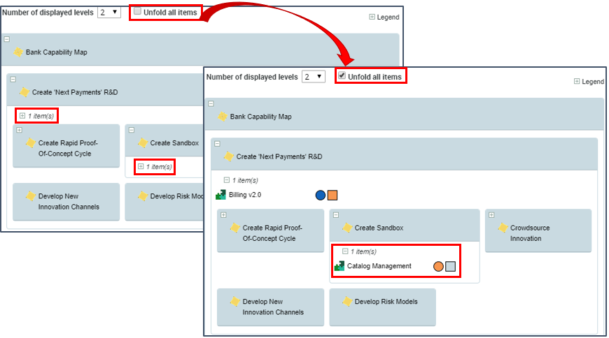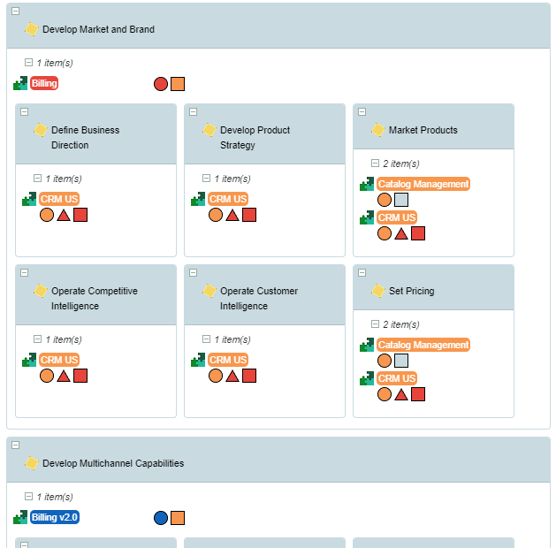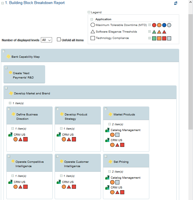 A breakdown report can be specialized according to each Solution specific needs. This type of report enables to display the breakdown of an “Architecture Building Block” type root object (e.g.: Capability map) into sub-objects of different types and analyze their fulfillment by “Solution Building Block” type objects (e.g.: Application).