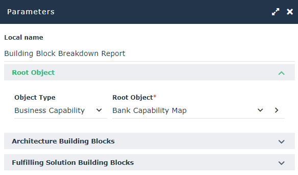 The “Building Block Breakdown Report” details the breakdown of a Root Object (e.g.: the "Bank Capability Map” Business Capability Map) according to selected classifier objects: