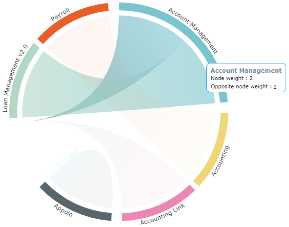 E.g.: the chord between "Account Management” (weight 1) and "Loan Management" (weight 0) applications.