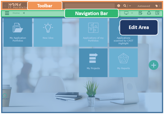 • a navigation bar (and window arrangement), common to all HOPEX desktops