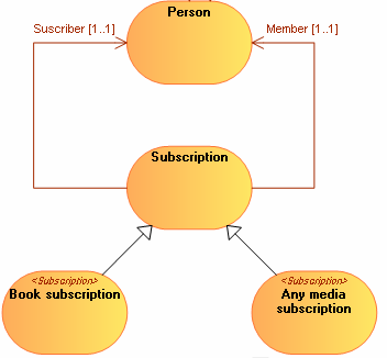 For example, the "Subscription" concept is broken down into "Book Subscription" and "Media Subscription". These two subscription types inherit the links "Subscriber" and "Member" at the level of the "Subscription" concept.
