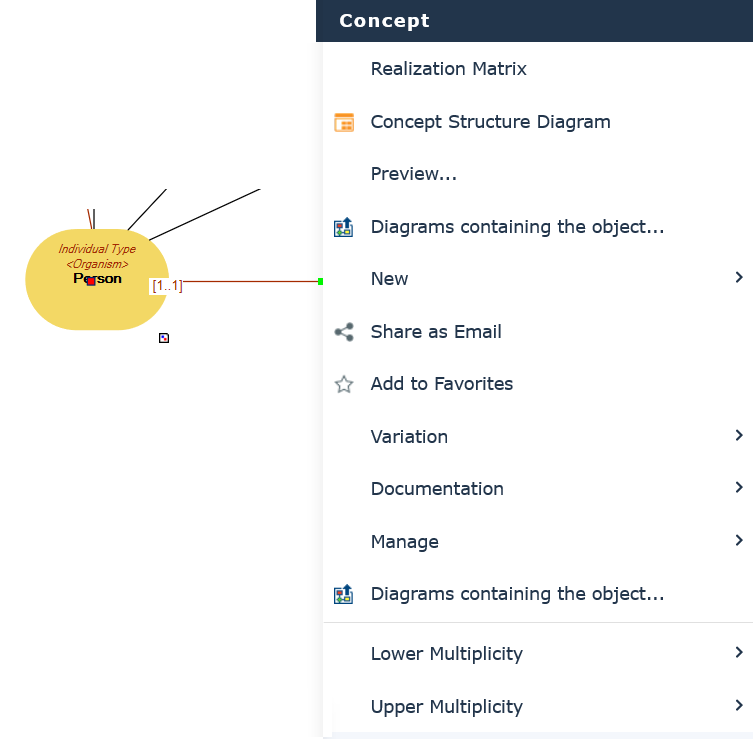 A concept diagram describes the information architecture. By default, you see in the concept diagram concepts, variations and individuals only.