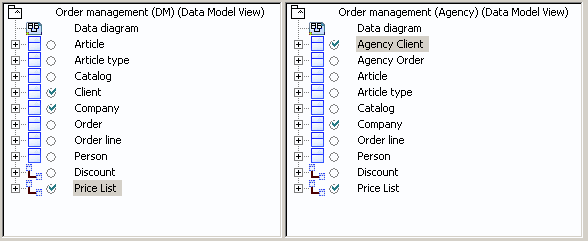 Different modeling levels can cover distinct requirements. Take the example of two data models. A business function data model "Order Management (DM)" is at conceptual level. It describes at business function level how orders should be managed.