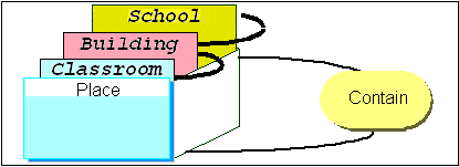 A classroom is contained in a building, which is contained in a school.