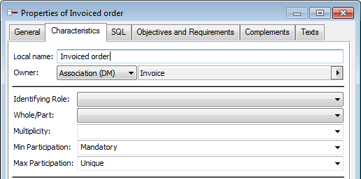 In the Characteristics tab of the property window of roles, you can indicate the minimum and maximum number of participations of each entity to the relationship (cardinalities).