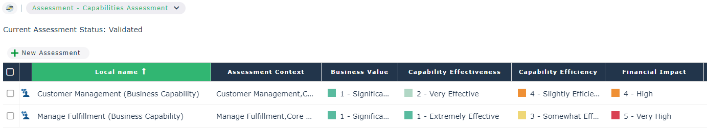 The assessment are based on a business capability map and are accessible using the enterprise stages to which the map is connected. These assessments are therefore valid in the context of a transformation stage and at a given date.