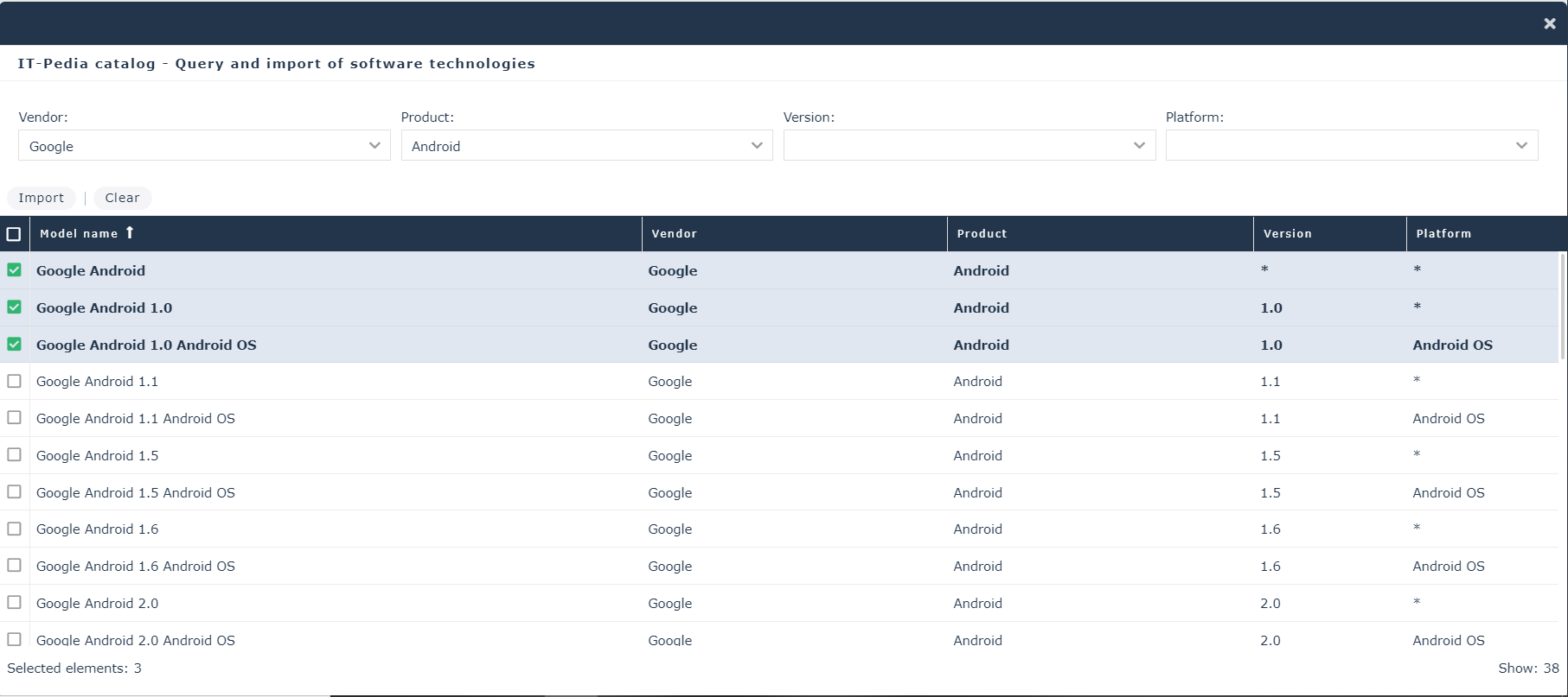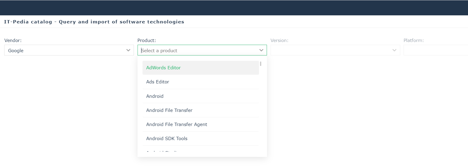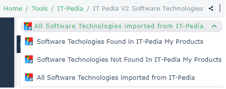 When you import technologies from IT-Pedia V2, these technologies are automatically added to the "My Products" list of the IT-Pedia catalog. When updating a technology in HOPEX, if the technology no longer exists in IT-Pedia, it is displayed in the list "Software technologies not found in IT-Pedia My Products".