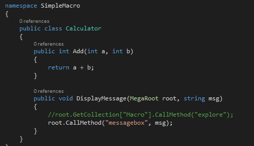 If you have used the macro template to create your project, you can directly use wrapper class like MegaRoot or MegaCollection. These wrappers belong to Mega.Macro.API namespace.