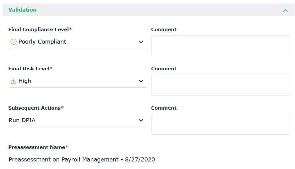 1. In the Pre-assessment tab of the processing activity property page, unfold the Validation section.
