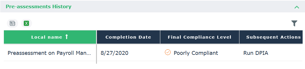 The information displayed is obtained through pre-assessments or DPIAs (the result of the most recent of the two is taken into account).
