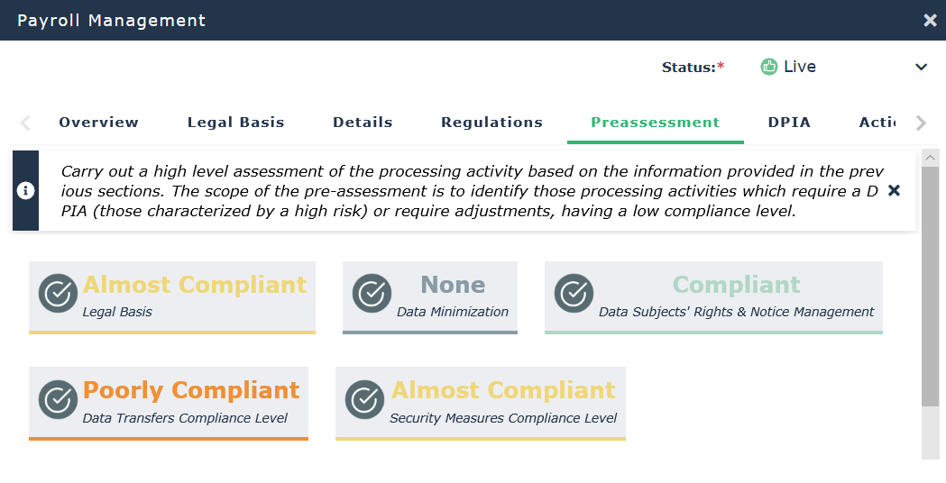 It is useful for the DPO or the Privacy team to get an overview of the processing activity compliance levels. It will facilitate prioritization of subsequent actions (decide if you need to perform a pre-assessement or a DPIA).