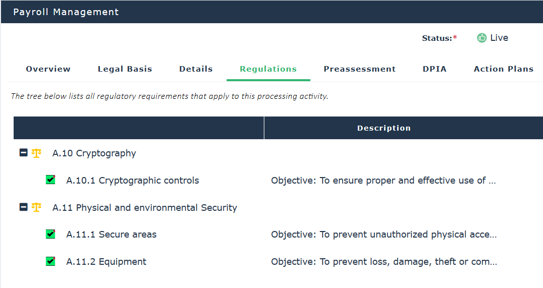 A navigation tree displays the regulations and requirements applicable to the processing activity. This tree is in read-only mode.