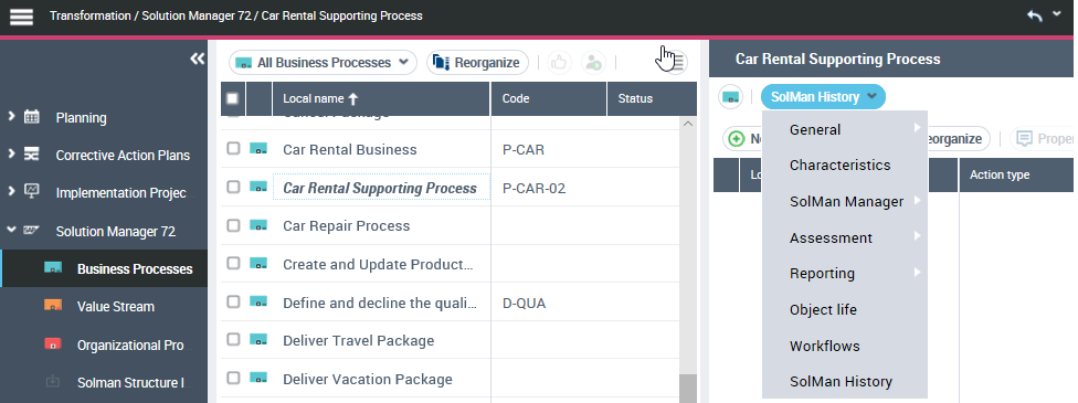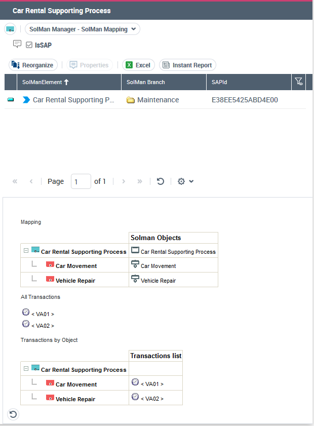 In this report, you can see all the objects that are mapped in SolMan, as well as all the associated transactions presented on a global level (all transactions in the business process) and on an individual level (transactions by object).