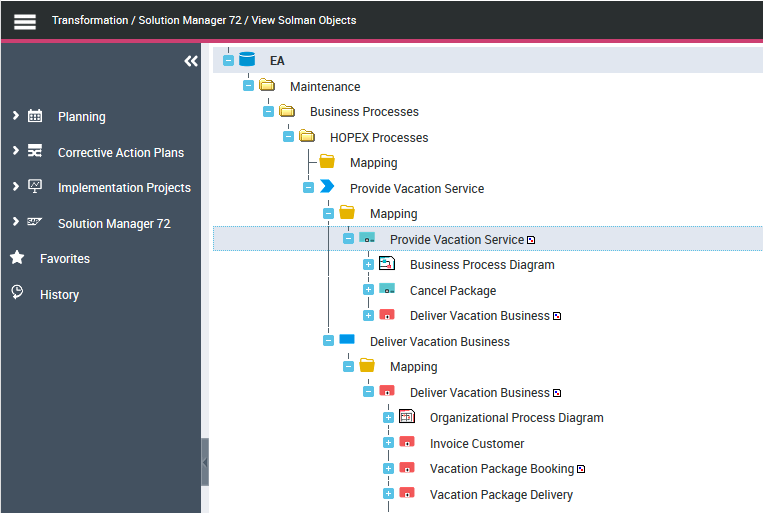 This command opens the tree showing the hierarchy of SolMan objects in HOPEX as well as the business objects associated with this hierarchy. This will be visible after generation of these objects.