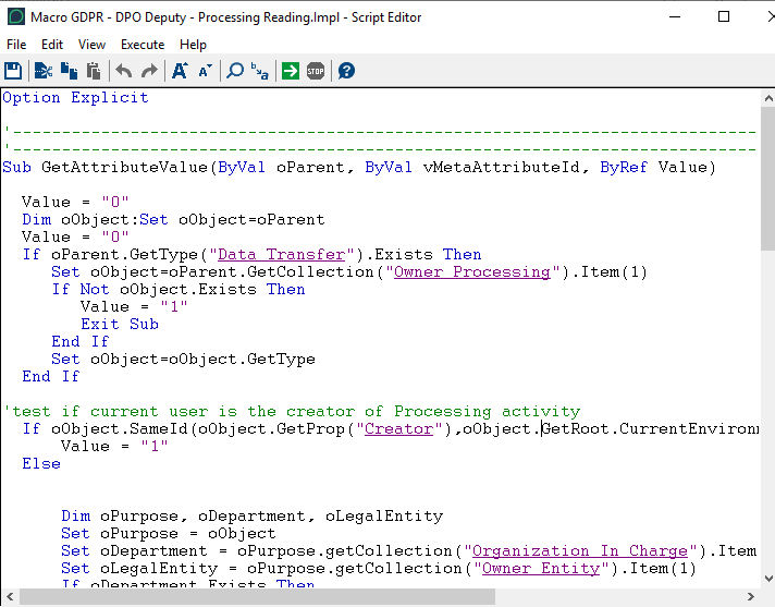 For information on the macro writing, see HOPEX Power Studio > Using APIs: Optimizing the macro of a dynamic data access rule.